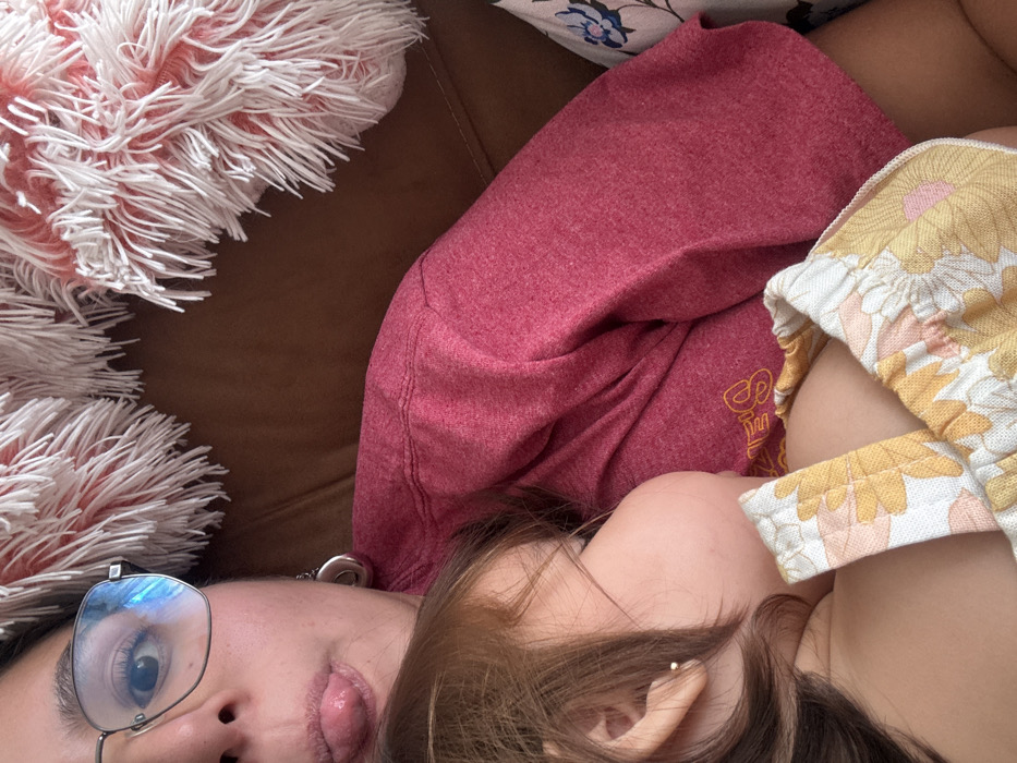 The image displays an adult female and a young child in an indoor domestic setting. The adult's left eye and a portion of her face are visible in the upper left, wearing metal-framed eyeglasses that reflect light. Her tongue is extended. She wears a circular silver-toned earring on her right earlobe and a maroon short-sleeved top with a faded yellow graphic. The child is positioned in the lower left, resting their head against the adult's chest area. The child has light brown hair, a small gold-colored stud earring in their right earlobe, and is wearing a light-colored top with spaghetti straps and a yellow, orange, and pink floral pattern. The background consists of a brown, possibly leather, surface. In the upper right quadrant, a fluffy pillow or blanket with white and pink/red fibers is visible. A patterned fabric with blue floral motifs on a light background is partially visible on the far right.