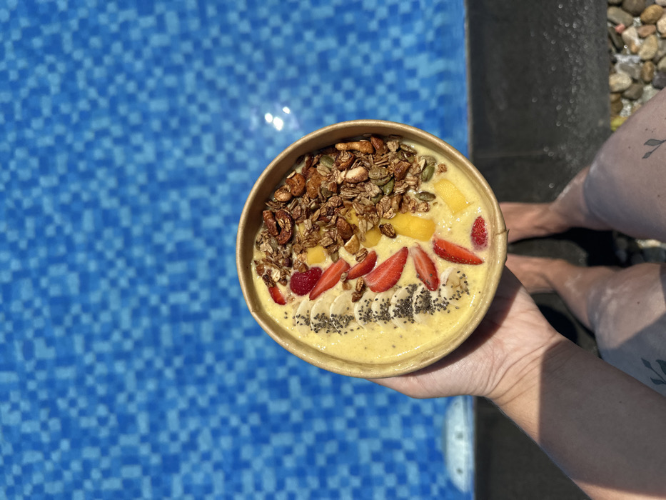 A bowl of smoothie decorated with sliced strawberries, banana, and mango, topped with granola and chia seeds, held by a hand near a swimming pool