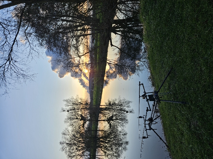 An outdoor scene captured at dusk in Gavisse, France, features a calm body of water flanked by a grassy bank and distant trees. In the foreground, positioned on the dark green grassy bank descending towards the water, a black three-rod carp fishing setup is deployed. The rod pod supports three dark-colored fishing rods, each equipped with a reel, extending over the water. The water's surface provides a clear reflection of the sky, bare trees, and industrial emissions. Along the opposite bank, deciduous trees, mostly without foliage, stand silhouetted, their reflections prominent in the water. In the background, a setting sun illuminates the horizon, partially obscured by terrain and sparse trees. To the right of the sun, significant white and gray plumes of smoke or steam ascend into the twilight sky, originating from an industrial facility, likely the Cattenom Nuclear Power Plant, located on the distant horizon. The sky exhibits a gradient from light blue overhead to warm orange and yellow hues near the horizon. No individuals are visible in the scene.