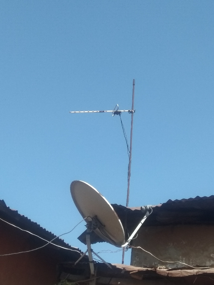 The image displays an outdoor scene in Maiburiji, Nigeria, under a uniform, clear blue sky. In the foreground, positioned above building structures, are two distinct antennas. A light-colored, off-white parabolic satellite dish with a central feed horn is mounted on a metallic support structure in the lower-center, angled upwards. Above and to the left of the satellite dish, a white Yagi-Uda antenna with multiple horizontal elements is fixed to a tall, vertical reddish-brown metallic pole. Electrical wiring, including black and white cables, is visible connecting to both antennas and extending downwards. Below the antennas, sections of corrugated metal roofing, appearing dark and weathered, are visible over two separate building structures. A light-brown building wall is partially visible beneath the roofline on the right, and a darker building section is present on the far left.