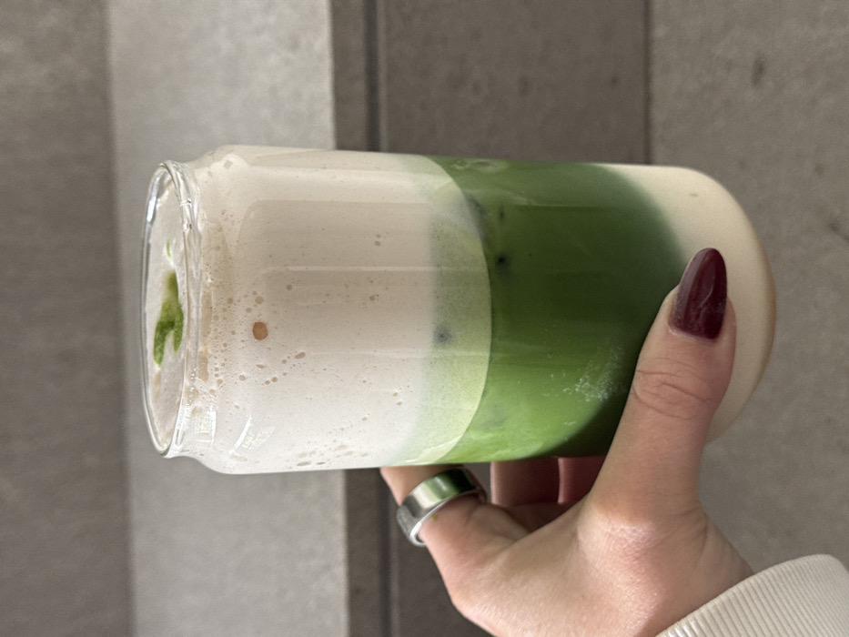 - "A hand holds a glass of layered matcha latte against a neutral wall" by FM-mxxFx1, licensed under CC BY 4.0