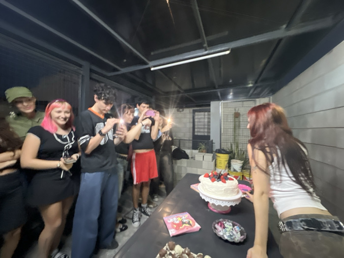 The image captures an outdoor gathering at night, under a covered patio structure, situated in a residential area of Quilmes Oeste, Argentina. Approximately eight young individuals are present. In the immediate foreground, a dark rectangular table displays a white two-layer cake adorned with strawberries and blueberries, resting on a white pedestal stand. Adjacent to the cake are a pink decorative item, a small black dish containing colorful objects, and a pink wrapper featuring cartoon characters. A portion of another dark-colored dessert is visible in the bottom-left corner of the table. On the right side of the table, a female with long, reddish-brown hair is seen from behind, leaning forward. She wears a white tank top and dark pants secured with a broad belt. To the left of the table, a group of seven individuals is gathered, facing towards the cake. From left to right: a partially visible person; an individual wearing an olive-green hat and jacket; a female with bright pink hair, smiling and holding a smartphone, dressed in a black top with white detailing and a black skirt; a male with dark, curly hair, wearing a black and orange jersey and loose blue pants, holding a smartphone; a female with dark hair, wearing a dark top and red shorts, holding a smartphone with an active flash directed forward; and two other individuals partially visible behind her, one also holding a smartphone with an active flash. The environment includes a dark overhead structure with exposed metal beams and artificial lighting fixtures. The background consists of a light-colored concrete block wall on the right and, further back, a building or enclosure with a window/door featuring horizontal bars. Potted plants, a yellow bucket, and various items are visible along the base of these structures.