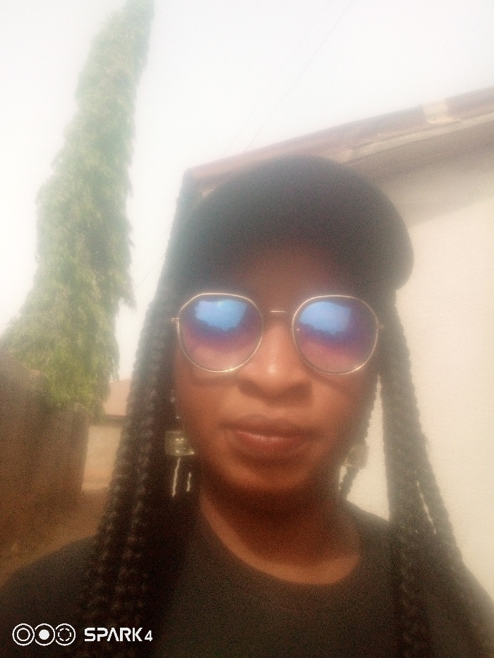 This image presents a frontal, waist-up view of an individual positioned outdoors in the city of Yelwa, Nigeria. The subject, an individual with dark skin, wears a dark baseball cap and large, round sunglasses with reflective blue and pink gradient lenses. Dark braided hair extends from under the cap and down past the shoulders on both sides of the subject's face. A metallic, multi-component earring is visible on the subject's left ear. The subject is wearing a dark, possibly black, t-shirt or top, with their lips closed in a neutral expression. The background on the left side of the frame features a tall, slender, dark green coniferous tree, with a darker building structure or wall visible beneath it. The background on the right side consists of a plain, light-colored wall, with a thin, dark horizontal architectural detail visible near the top right corner. The upper portion of the background, including the sky, appears significantly overexposed due to bright ambient light. A "SPARK 4" watermark is present in the lower left corner of the image.