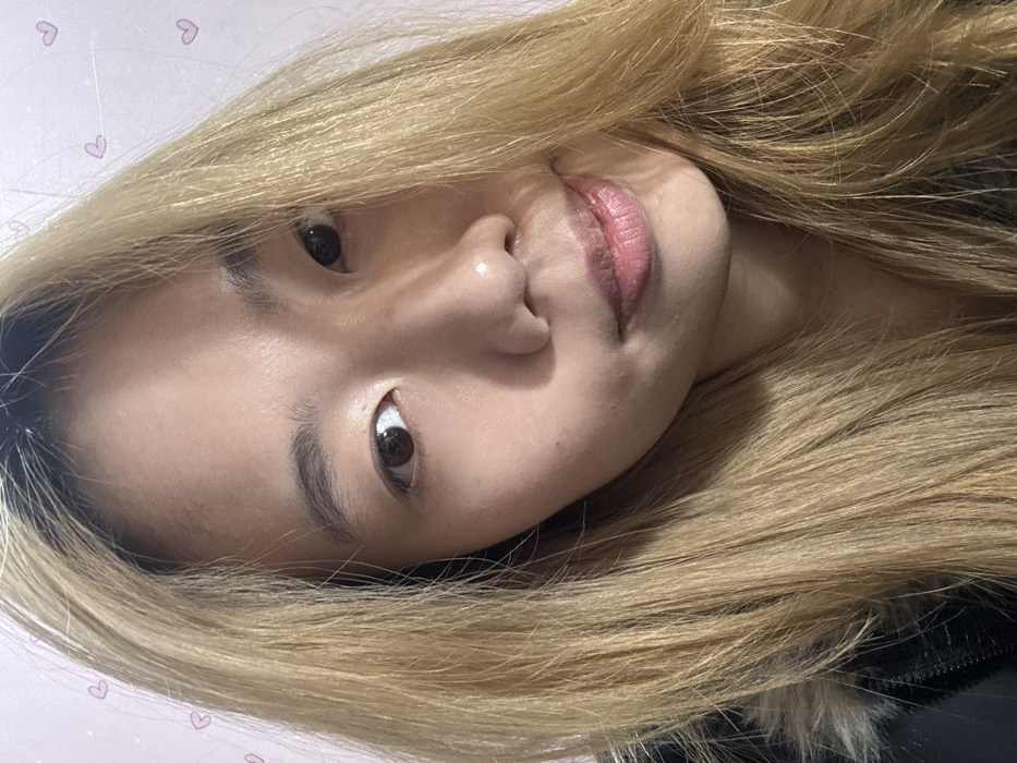 The image depicts a close-up, headshot-style portrait of a single individual, identified as an East Asian female, in Shapingba District, China. The subject faces the camera directly, presenting a neutral to slightly smiling expression with closed lips that display a natural pink hue. Her long, straight hair, dyed blonde with visible darker roots, frames her face and extends over her shoulders, partially obscuring a dark-colored garment with a visible faux fur collar on the lower left. Her eyes are dark brown and look forward, while her eyebrows are naturally shaped and dark. The background consists of a light pink wall adorned with faint, scattered, outlined heart shapes in a lighter pink tone. Illumination is even, highlighting the subject's facial features and clear complexion.