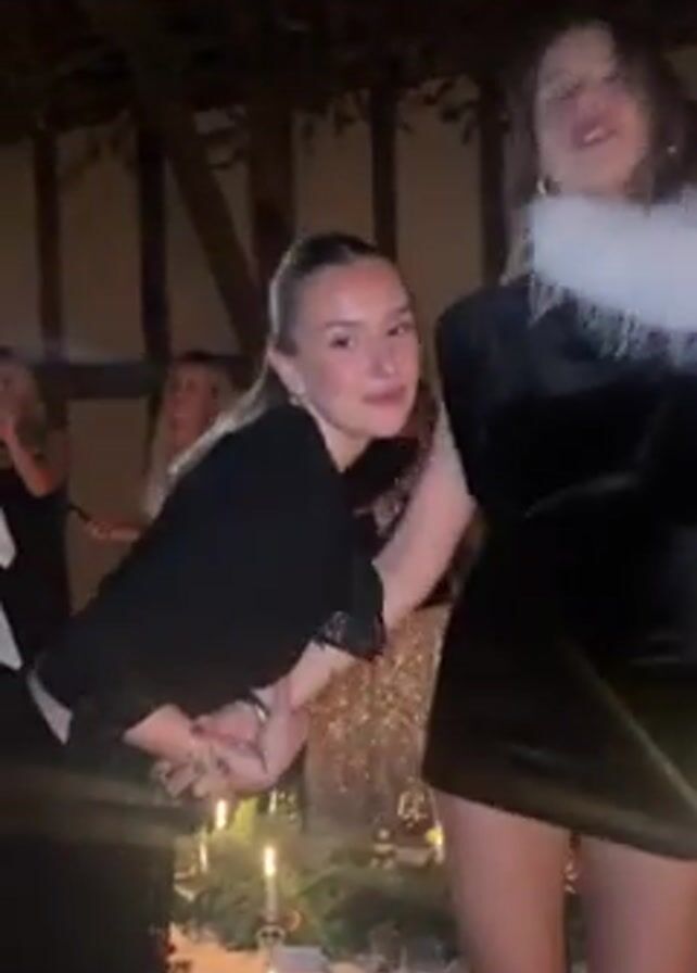 two women dancing at a party. The woman in the foreground is wearing a short, black velvet dress and a white feather boa. She is singing along to the music and gesturing with her hands. The woman beside her is wearing a black top and appears amused by the dancing woman. There are other partygoers visible in the background. A table is covered with candles, greenery, and glasses, suggesting a holiday gathering. The setting appears to be indoors, with wooden beams visible above.