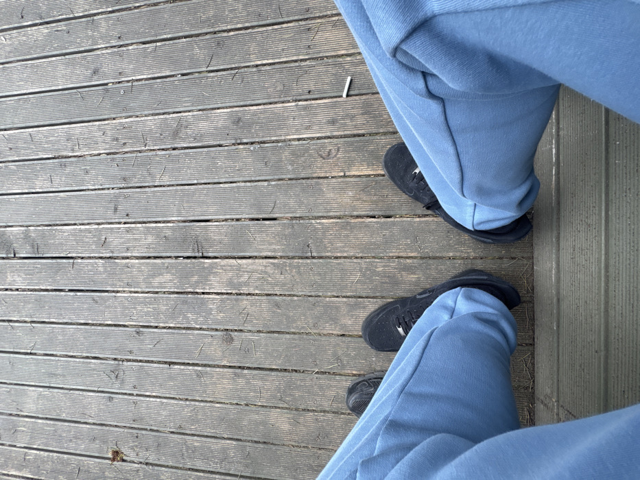The image presents a first-person, downward-looking view of an individual's lower extremities. The subject is wearing light blue sweatpants, with the fabric visible from the knees down, and black athletic shoes on both feet; the right shoe appears to be a Nike Air Force 1. The individual is positioned on a slightly lower level, with their feet resting on a weathered wooden deck or boardwalk. This surface is constructed from numerous greyish-brown wooden planks arranged vertically, extending away from the viewer. The planks exhibit signs of wear, including dirt, small bits of organic debris such as dried leaves and pine needles, and visible screw fastenings. To the right of the right foot, a discarded white cigarette butt is present on the wooden surface. A darker, horizontal wooden beam or edge is visible at the very bottom of the frame, indicating a transition in the flooring or a step. The specific location within the city of Stara Zagora, Bulgaria, is not discernible from the visual information provided in the image.