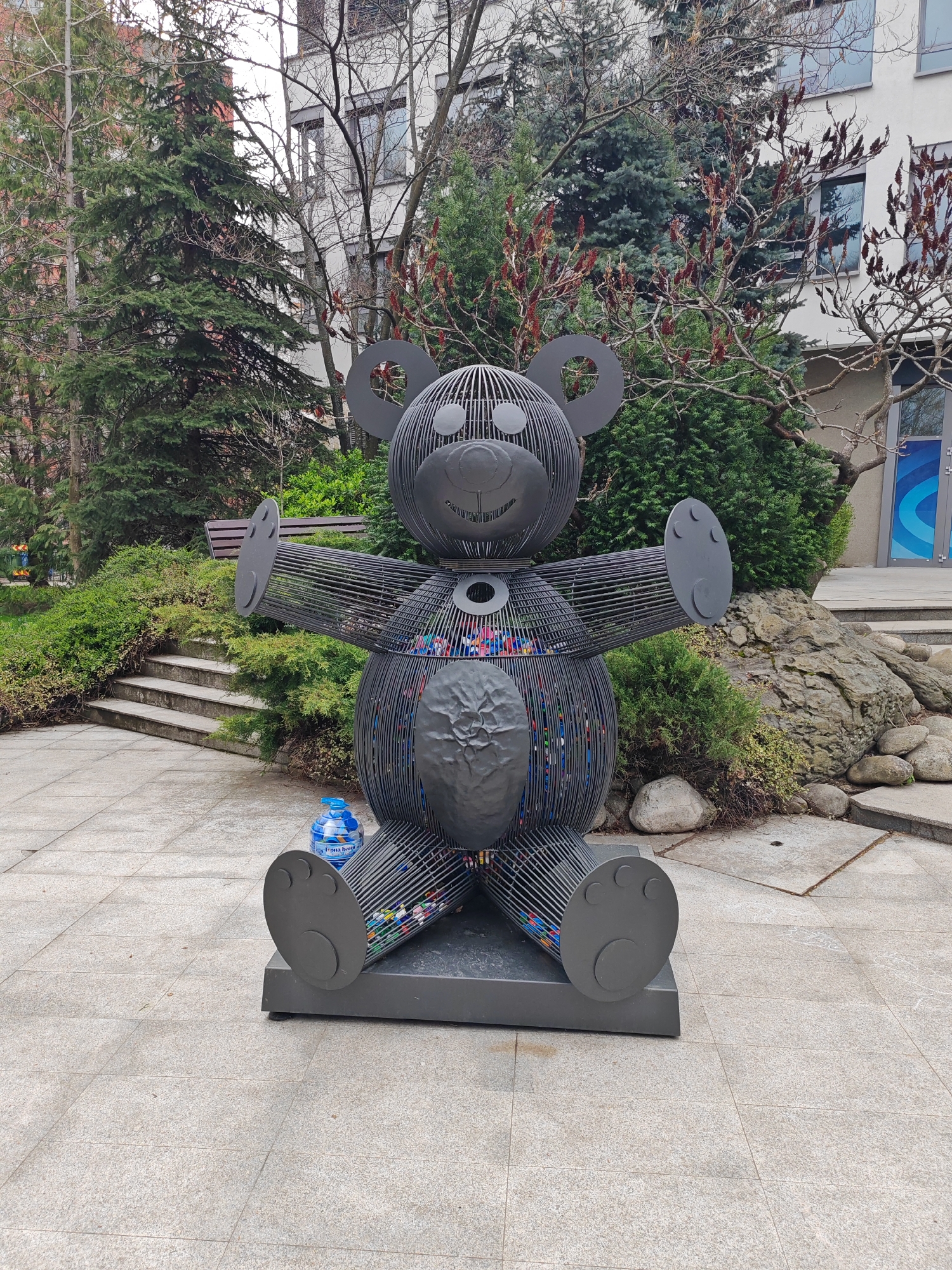 wire-frame bear sculpture, filled with plastic bottle caps, standing in a public space in Sofia, Bulgaria