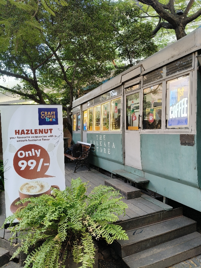 This image depicts the exterior of "The Kolkata Store" in Bidhannagar, India, housed within a repurposed pale green and white tram or train carriage