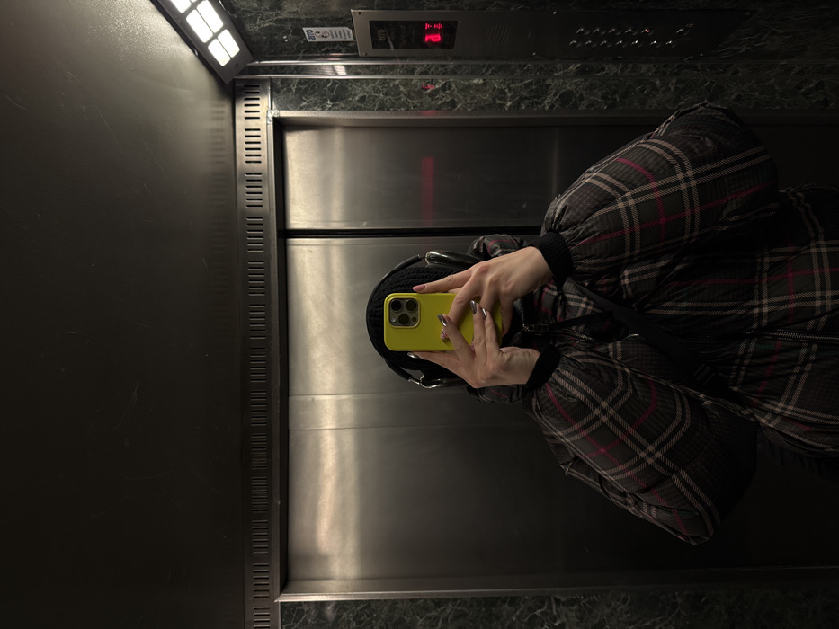 An overhead shot inside an elevator features a person taking a selfie with a yellow-cased phone. The subject wears a black beanie and a puffy, plaid jacket with hues of brown, black, and pink. The elevator's interior is visible, including metal doors and walls, bright overhead lights, and an indicator panel showing the number 1. The elevator floor is marble or granite. The phone and hands are positioned to capture a reflection in the elevator's door.