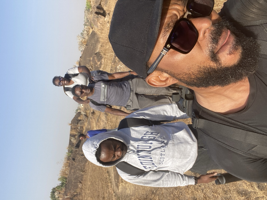 Five people stand outdoors, likely on a hill. The closest person wears a black cap and sunglasses. A gray hoodie-clad person is positioned below and to the left. Two more people are situated further back, one in a white shirt and the other in a gray shirt. The fifth person is indistinct and wears a blue top. The foreground has dry grass, while the sky above is clear. The image appears to be a selfie.