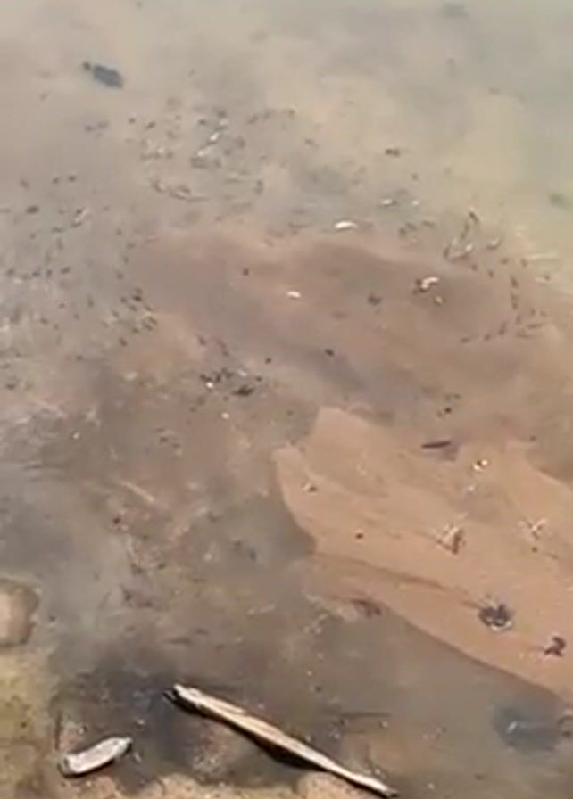 shallow body of water with a sandy bottom. Scattered across the bottom are small twigs, leaves, and debris. A small stick lies on the sand near the lower part of the frame. Numerous tiny fish or minnows are swimming in the water, mostly concentrated in the central area. The water is slightly murky, reducing visibility to the bottom. The camera's focus shifts slightly at one point. The overall scene is natural and somewhat undisturbed.