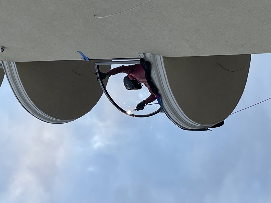 - "An individual is depicted welding a curved metal railing on a semi-circular balcony of a multi-story, light-colored building in Čanj, Montenegro" by FM-ljeCD2, licensed under CC BY 4.0