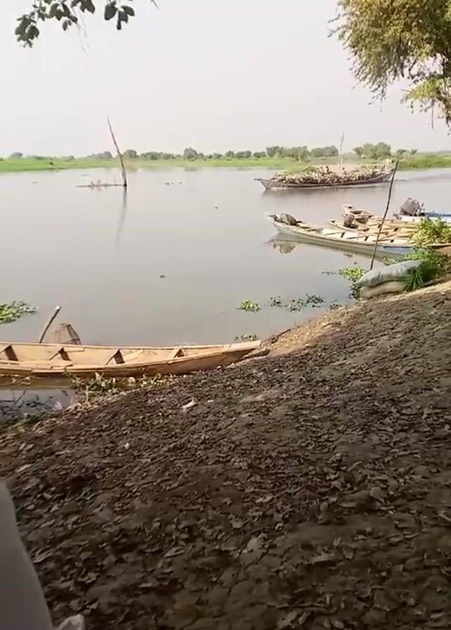 river scene on a bright day. Several boats are visible on the water. One boat, appearing to be a motorboat, is loaded with what seems to be bundles of sticks or firewood, moving across the river. Other boats are moored along the riverbank, some appearing to be simple wooden canoes. The riverbank is muddy and covered with foliage. There are trees on either side of the river, partially obscuring the view. The water is relatively calm, reflecting the sky. A hand appears briefly in the lower left corner of the frame.