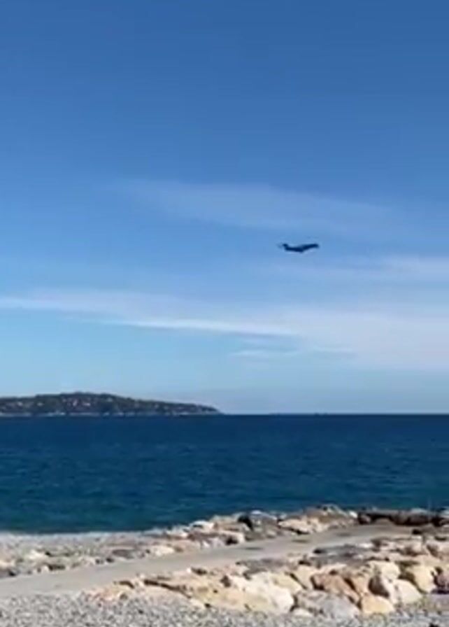plane flying across a blue sky towards a distant coastline over a body of water. In the foreground is a beach area made of rocks and pebbles. Two people are sunbathing on the beach.