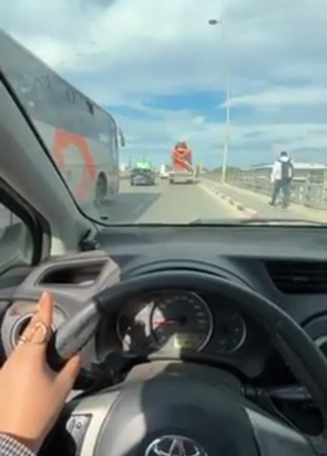 A person is driving a car on a road with other vehicles, including a large bus and a construction vehicle. The driver's hand is visible on the gear shift. The sky is cloudy. The video is shot from the driver's point of view.
