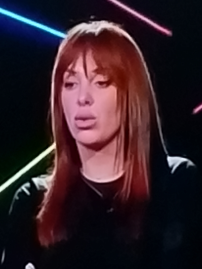 A woman with long auburn hair and bangs is depicted in a medium shot. She has a fair complexion and full lips. She is wearing a black shirt and a delicate necklace. The background is black with blurred neon lights in blue, pink, and green. Her expression appears neutral or slightly pensive. The overall image suggests a setting in a television studio or a similar environment with professional lighting.