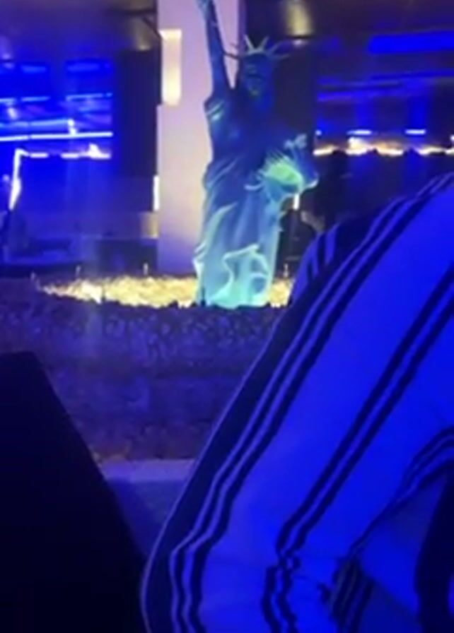 medium shot, slowly panning up to reveal a small, neon blue Statue of Liberty replica. The statue is on a mound of decorative stone and lit with various lights. It is situated in what appears to be an indoor venue, possibly a nightclub or restaurant. The camera then shifts, partially obscuring the statue with an individual wearing a dark blue and white striped shirt. Sounds of music and conversation are audible.