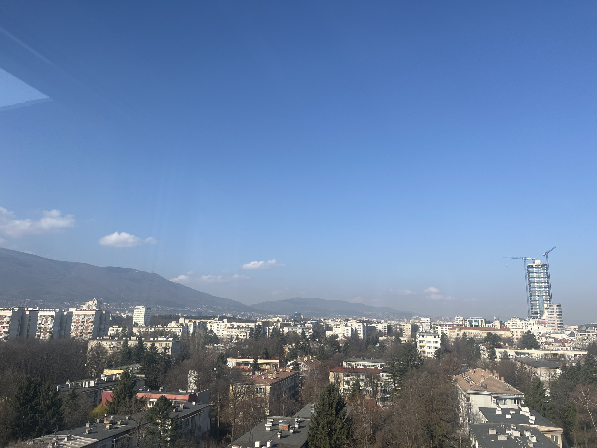 - "The image displays an expansive, elevated view of Sofia, Bulgaria, under a clear, bright blue sky with a few scattered white cumulus clouds" by FM-TV8UE3, licensed under CC BY 4.0