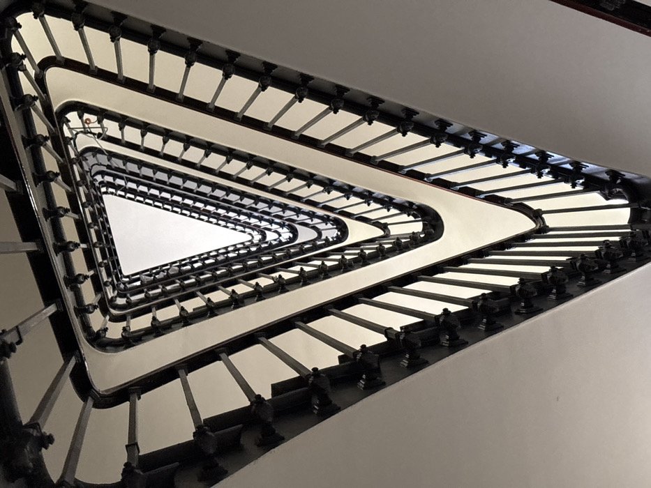 - "This image presents an upward, forensic view of a multi-story triangular staircase, located in Asnières-sur-Seine, France" by FM-3pJMh1, licensed under CC BY 4.0