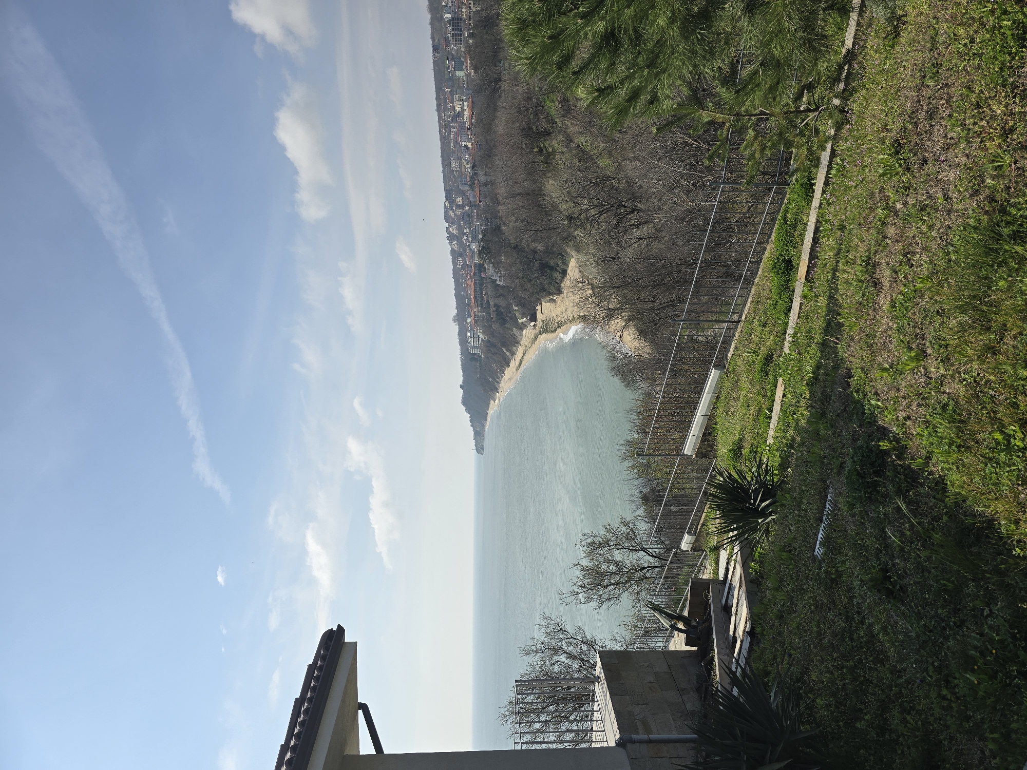 The image captures a view of the coastline in Byala, Bulgaria. The Black Sea stretches towards the horizon under a partly cloudy sky. A sandy beach runs along the coast, backed by wooded cliffs with buildings visible atop. The foreground features elements of an elevated perspective, including a partial view of a rooftop, a stone wall, and a grassy area with shrubs and plants. A metal railing is visible, marking the boundary of the elevated vantage point.