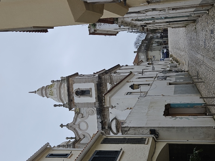 A narrow, uphill cobblestone street in Cascais, Portugal, is depicted under an overcast, light grey sky. On the left, a multi-story building with white stucco walls, dark louvered shutters, and a white rain gutter system is visible. This building is adjacent to a prominent church structure featuring white stucco walls with stone accents, a multi-tiered bell tower topped with a decorative dome, and a cross. The church facade exhibits areas of discoloration and cracking. Several ornate black street lamps are affixed to the buildings along the left side. The right side of the street is bordered by multi-story buildings, including a partially visible light-colored structure in the foreground. Further along, white buildings with balconies and traditional red-tiled roofs are observed. The street itself is paved with small, irregular cobblestones (*calçada portuguesa*) and includes a central drainage channel. A series of short, metallic bollards lines both sides of the street, delineating the pedestrian area from the roadway. No individuals are present in the immediate or mid-ground. In the distance, at the crest of the incline, a blue and white van is parked near other residential structures and a bare tree.