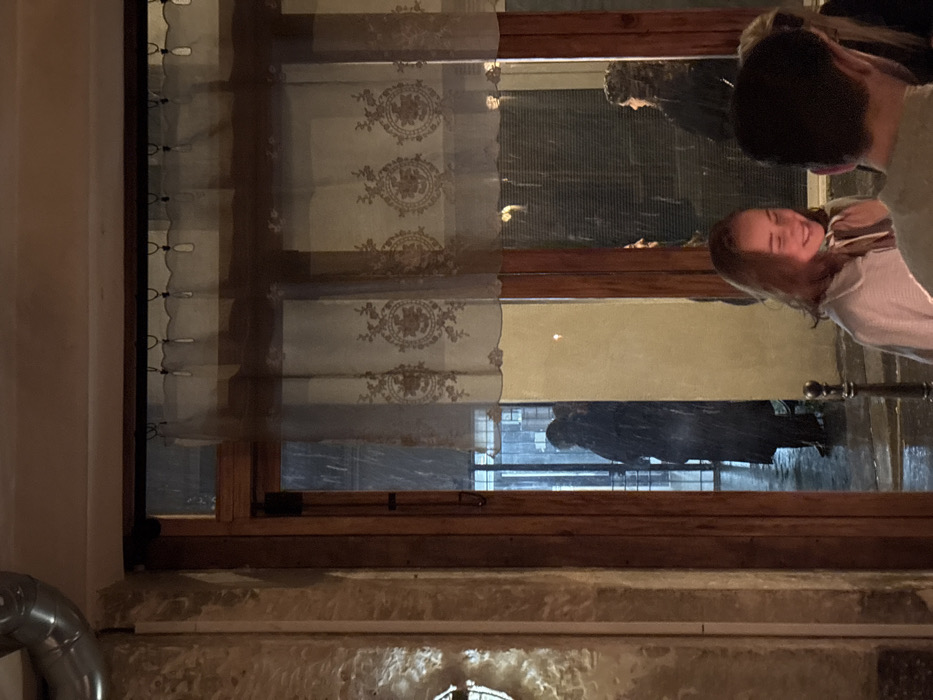 A brown-framed window with partially lowered floral-patterned curtains is visible. Through the window, a rainy or snowy cityscape is blurred. Reflected in the glass are two people, one with dark hair closer to the window, and another smiling with blonde hair. The foreground shows a textured wall and a metallic pipe. The overall scene is dimly lit, creating a cozy, indoor atmosphere contrasted with the inclement weather outside.