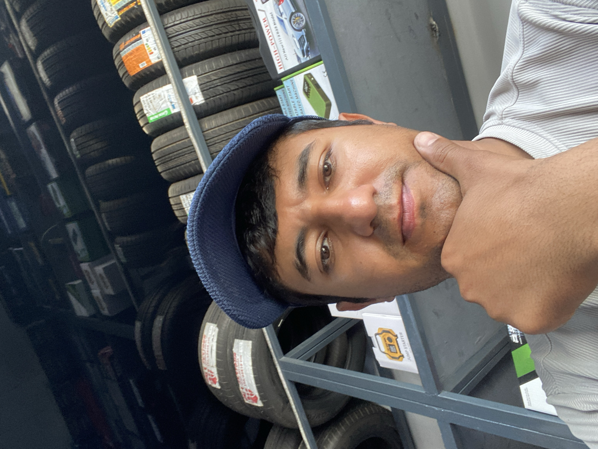 A man with dark hair, brown eyes, and tanned skin, wearing a blue baseball cap and a light gray striped shirt, poses for a self-facing photograph inside a tire shop