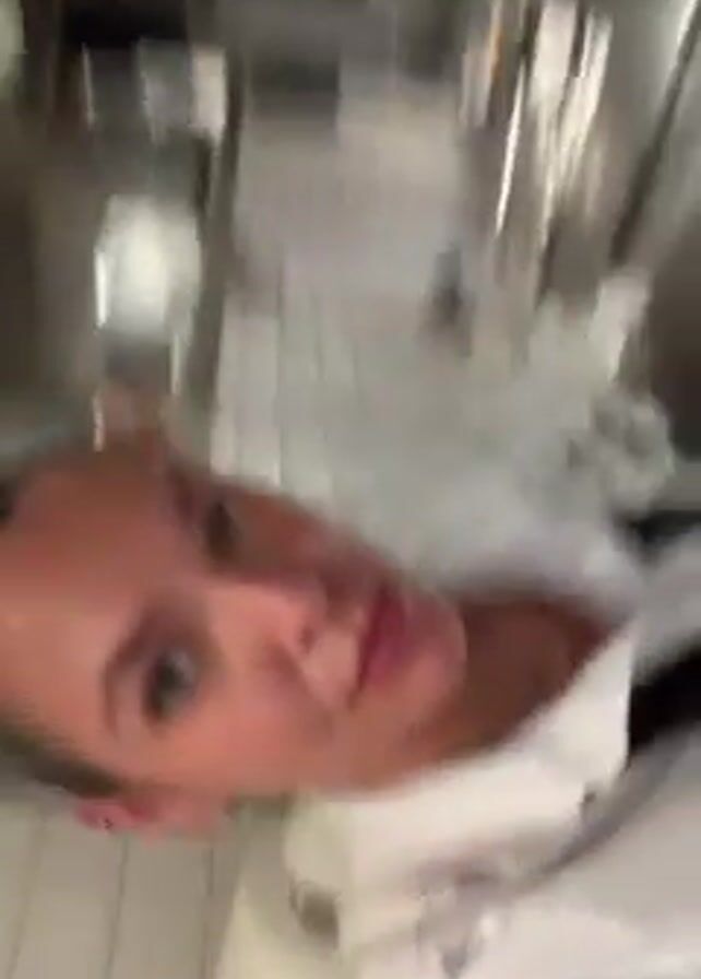A young woman with blue eyes wearing a white top exhales white smoke toward the camera. She then spins the camera around in a kitchen, showing stainless steel surfaces, a rack with supplies, and white tiled walls.