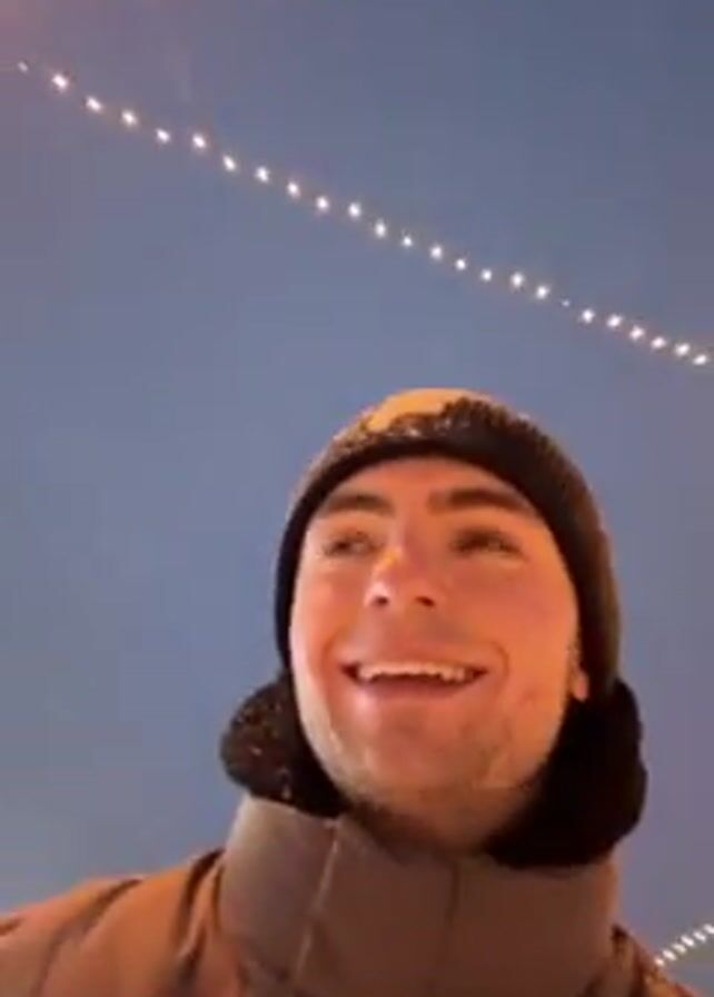A young man, probably in his late teens or early twenties, is facing the camera, likely holding it at arm’s length in a selfie position. He is wearing a dark-colored, possibly black, beanie with a white or light-colored logo on the front, and a dark-colored puffer jacket. He is smiling. The background shows a nighttime scene with rows of string lights hanging overhead. The ground appears to be covered in snow, suggesting an outdoor winter setting. As the video progresses, the color of the string lights changes from yellow to blue.