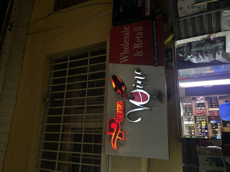 A brightly lit “Perez Wine” wholesale and retail sign hangs outside a building