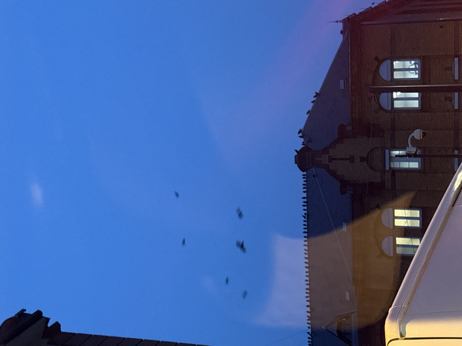 A building with lit windows and a security camera is reflected in a surface. Birds perch on the rooftop and along the edge of the building. Several dark silhouettes resembling birds are visible against a blue sky. The bottom of another building and a white vehicle are also visible.