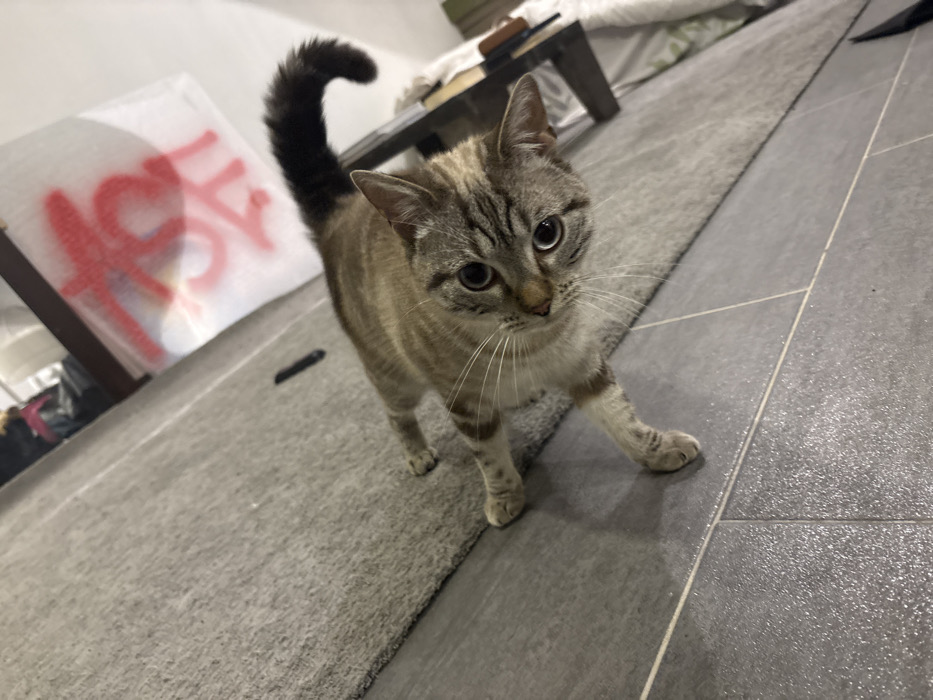 A tabby cat stands on a grey rug, partially on a grey tiled floor, looking directly at the camera with dilated pupils. Its fur is light brown with darker grey-brown stripes, and its tail is dark and bushy, curled upwards. The cat's front left paw is extended forward. On the rug to the left, a dark rectangular object is visible. In the background, a white surface with red spray-painted graffiti is present, partially obscured by a dark wooden furniture item. The scene is illuminated by an overhead light source, casting soft shadows. This domestic interior is located in Saint-Denis, France.