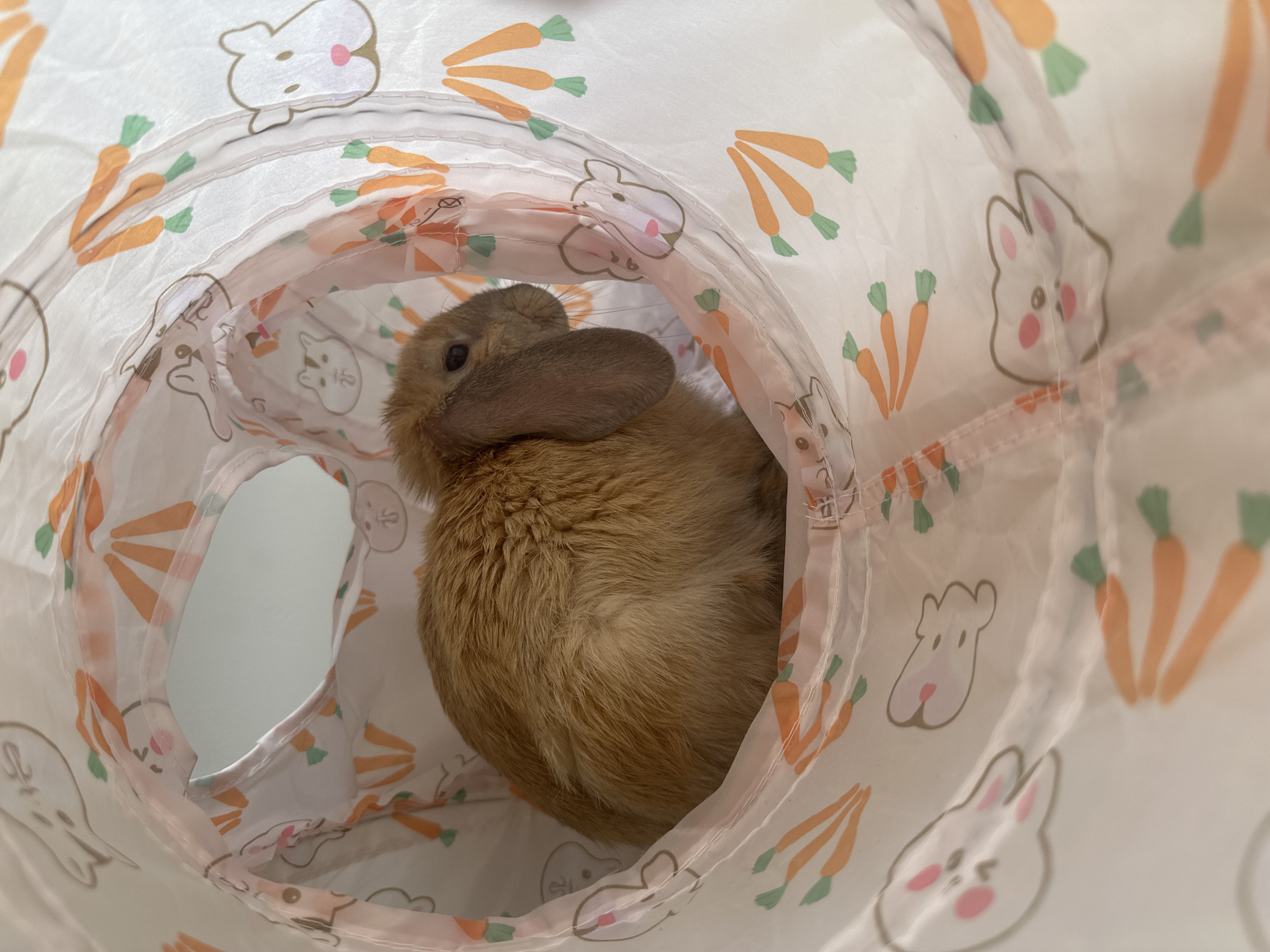 A light brown rabbit sits inside a white tunnel decorated with cartoon rabbits and orange carrots