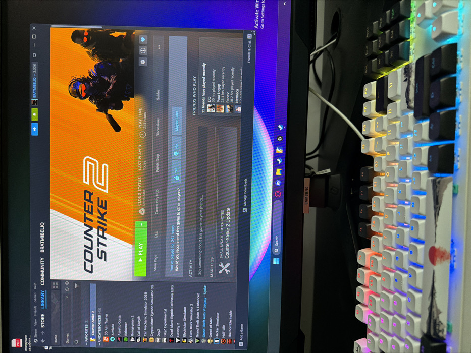 The image depicts an indoor computer setup within the city of Dobrich, Bulgaria. The central subject is a Samsung brand monitor displaying the Steam client interface. The "LIBRARY" tab is active, showcasing "Counter-Strike 2" as the selected game. The game's title and an orange-themed background with two armed figures wearing red-tinted visors are prominent. The "PLAY" button is green, and the displayed play time for "Counter-Strike 2" is 241 hours. The user account name "BRATMIBELIQ" is visible, along with a balance of "3,33€." A section titled "FRIENDS WHO PLAY" indicates "11 friends have played recently," listing "DO," "Pour1ngup," "Panev," and "Nemeca" with their respective playtimes. Below, a "SMALL UPDATE / PATCH NOTES Counter-Strike 2 Update" from March 19 is displayed. The Windows taskbar is visible at the bottom of the screen, along with an "Activate Windows" watermark on the lower right. In the foreground, a mechanical gaming keyboard with white keycaps and multi-colored RGB backlighting is positioned. The spacebar features an artistic graphic of mountains and a red sun. The monitor rests on a dark-colored surface, presumably a desk, with visible cables behind the keyboard and below the monitor stand.
