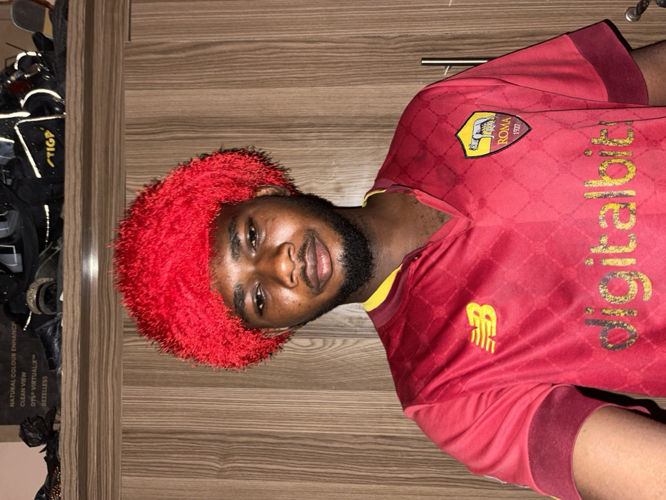 An individual, identified as male with dark skin and a short beard, is depicted in an indoor setting within Unguwar Gabas, Nigeria. The subject wears a bright red, fluffy, textured hat or wig and a red short-sleeved collared shirt with yellow trim. The shirt features a yellow New Balance logo on the right chest, a "ROMA 1927" club crest depicting the Capitoline Wolf on the left chest, and "digitalbits" text in yellow across the torso. The background consists of vertical light brown wood-grain paneling, likely a closet or wall. Above the subject's head, on a dark shelf, several dark objects are visible, including items with partially legible text such as "NATURAL COLOUR ENHANCEMENT," "CLEAN VIEW," "DTS® VIRTUALX™," "BEZELLESS," and "STIGP." The subject faces the camera with a neutral expression.