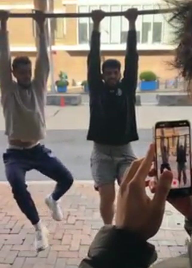 Two men are hanging from a metal bar, while a third person records them on a smartphone