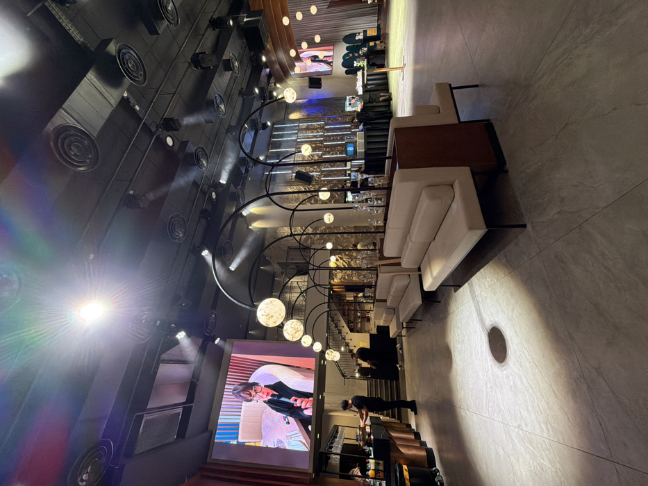 An oblique shot depicts a modern interior with a dark ceiling featuring numerous spotlights and circular vents. A large screen displays a person. Arched light fixtures with spherical bulbs illuminate the space. White sofas with dark accents line the right side, leading towards a distant seating area with green chairs. A bar is visible in the foreground with two people. The floor has a grey tile finish.