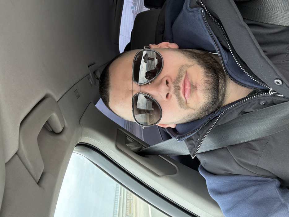 The scene depicts an adult male individual inside a vehicle, likely a car, on a highway in the vicinity of Ivanyane, Bulgaria. The male, with short dark hair and a trimmed beard, is seated in the driver's position and is looking directly at the camera, appearing to take a selfie. He is wearing dark aviator-style sunglasses, a dark blue hooded sweatshirt, and a dark quilted vest, with a grey seatbelt securely fastened across his left shoulder and chest. The vehicle's interior features a light-colored headliner, A-pillar, and a passenger-side grab handle. Through the front and side windows, a multi-lane highway with a light-colored concrete barrier or bridge railing is visible under an overcast sky. Reflections in the sunglasses reveal the mobile device used for the photograph and additional elements of the exterior road environment.