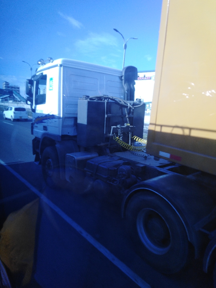 A white cab-over truck with a yellow trailer is on a road, a white car is visible ahead on the left. Streetlights are visible and what looks like a billboard or sign is also in view. The image is taken through a bluish tint, possibly a window. The truck's black equipment box behind the cab is prominent, as is the yellow coiled trailer cord. A portion of what could be a seat is in the lower left corner.