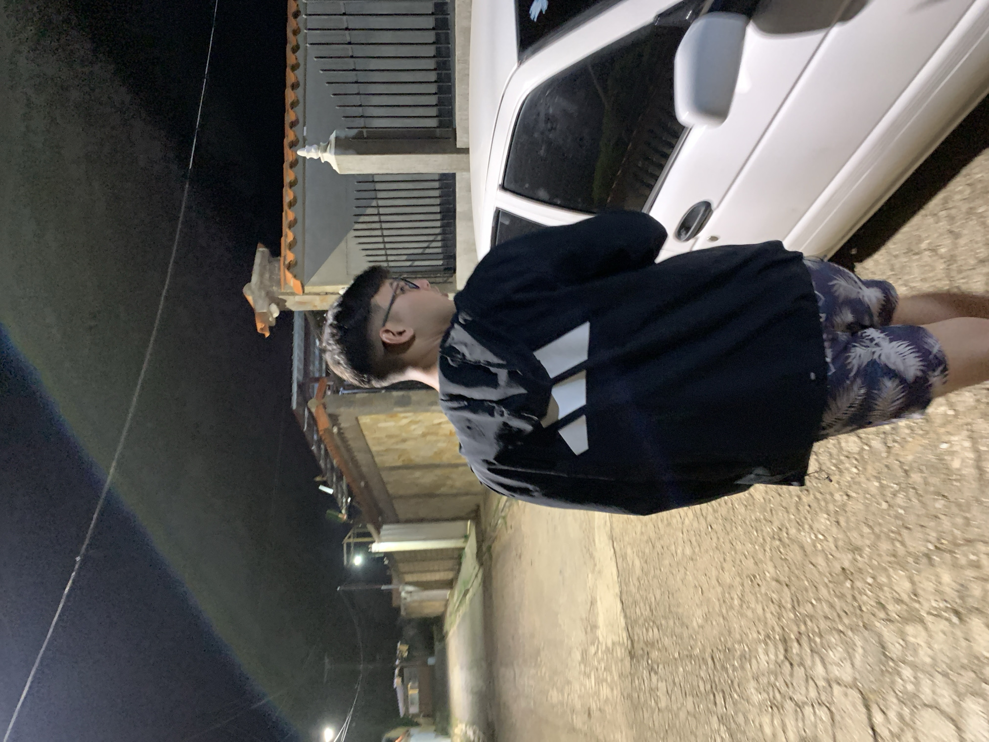 person wearing a black Adidas sweatshirt and patterned shorts standing next to a white car on a paved street in La Tagua, Venezuela, at night