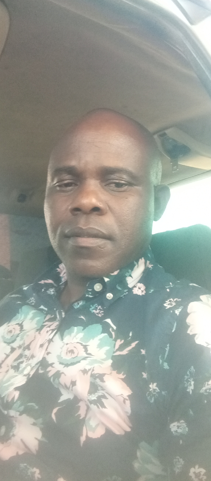 A male individual with dark skin and a bald head is depicted in a close-up, chest-up selfie. He is wearing a dark-colored button-up shirt with a light-colored floral pattern, featuring shades of pink and teal flowers. The shirt's collar is visible, with two white buttons unfastened at the neckline. His gaze is directed forward, towards the camera. The setting appears to be the interior of a vehicle, indicated by the visible light-colored headliner and a dark structure, possibly part of the doorframe or pillar, on the left side of the frame, and a glimpse of what may be an overhead console or sun visor component on the upper right. The lighting suggests an ambient, possibly overcast or indoor light source. No other individuals or specific objects are clearly discernible, and no distinct actions beyond posing for the photo are evident. The location is undetermined.