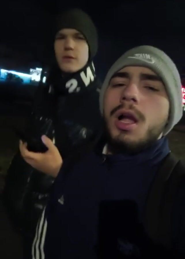 Here is a brief description of the video: Two young men are walking outside at night, likely in an urban area. The foreground features a man recording with a cell phone. He has dark hair, a beard, and is wearing a gray beanie and a blue jacket. Behind him, the second man wears a dark green beanie and a jacket with white stripes on the sleeves. He gestures and smiles at the camera. The environment is dark, with some streetlights visible in the background.