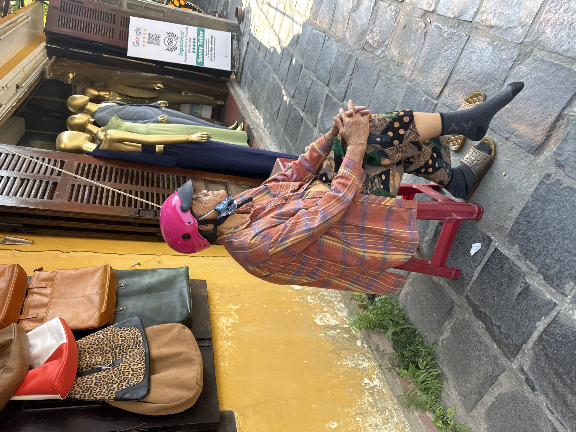 The scene captures a man seated on a red plastic stool in Hội An Ward, Vietnam. He wears a pink helmet and a plaid shirt, with his hands clasped together. He is also wearing patterned pants, socks, and sandals. Next to him are multiple leather bags displayed on a dark surface. Behind him are mannequins dressed in various clothing. The location appears to be a storefront with a sign indicating "Sunny Tailor" with Google and Tripadvisor awards. The ground is paved with stone blocks, and there are plants growing along the edge.