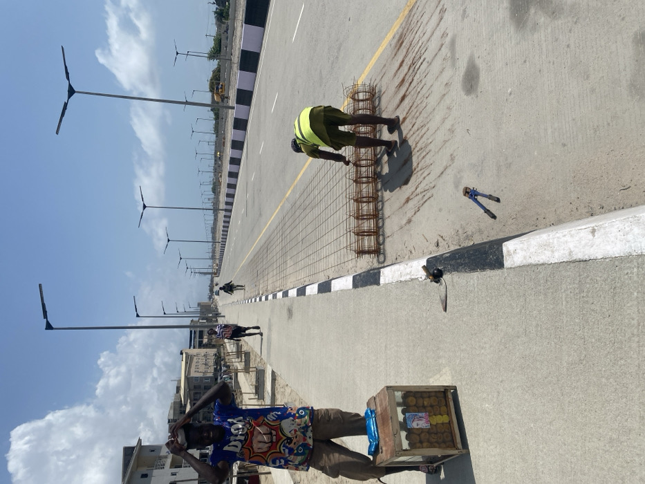The scene depicts a sunny outdoor environment along a newly constructed or extensively renovated multi-lane road in Alaguntan, Nigeria. The sky is bright blue with scattered white cumulus clouds. The road surface is asphalt or concrete, featuring yellow center lines and white edge lines. A black and white striped concrete median or barrier separates the main thoroughfare from a wide unpaved shoulder on the right, where extensive land development or construction is ongoing, indicated by distant yellow heavy machinery. In the foreground, a dark-skinned male stands on a concrete sidewalk on the left, facing slightly right, with his hands raised to his head. He wears a blue t-shirt with a colorful comic book-style graphic and brown cargo shorts. He smiles towards the viewer. Adjacent to him is a small, clear-paneled wooden display box, likely a vendor's stall, containing numerous round, yellowish fried food items and some yellow wrapped goods. A blue plastic package rests on top of the box. Further right, on a sandy strip adjacent to the road, another dark-skinned male, wearing a yellow high-visibility vest over a dark shirt and dark shorts, is bent over, facing away from the camera. He is manipulating sections of rebar mesh laid flat on the ground, which includes several cylindrical rebar cages. The ground around him shows rust-colored streaks, possibly from the rebar. A pair of blue-handled wire cutters lies on the sandy surface to his left. A silver trowel-like tool and another dark object are visible near the curb closer to the first individual. In the mid-ground, two other dark-skinned individuals walk along the concrete sidewalk, heading away from the viewer. The road is lined with numerous modern streetlights featuring tall, slender poles and Y-shaped fixtures, extending into the distance on both sides. Buildings, appearing to be multi-story residential or commercial structures, are visible along the left side of the road in the mid-ground. The overall impression is an active construction or development zone on a clear day.