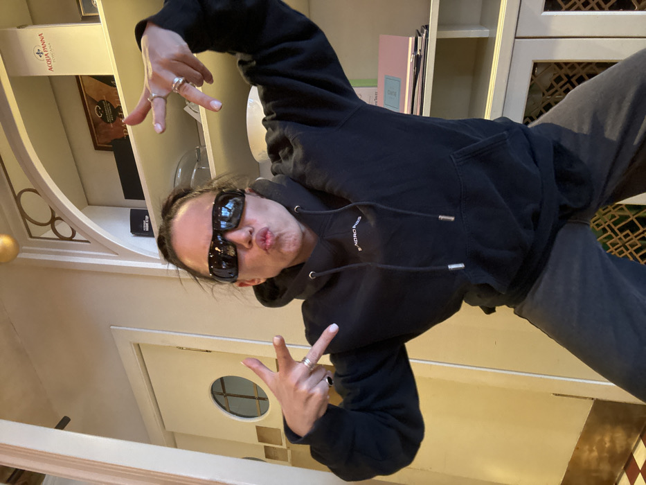 A female individual is captured in a dynamic, frontal pose within an upscale interior in Moscow, Russia, likely a restaurant or café. She wears a black hooded sweatshirt with "SANDRO PARIS" embroidered in white on the chest, paired with dark grey or black pants, and dark, sporty sunglasses. Her hair is pulled back, and she has multiple rings on her fingers, two on the left ring finger and two on the right middle finger. Both hands are raised, forming "V" or "peace" signs, with palms facing outwards. Her lips are puckered in a "kiss" or "duck face" expression. The environment features cream-colored walls and ornate decorative elements. To the left, a cream-colored door with a distinct circular window, featuring a grid pattern, is visible. The floor in this area has a red and off-white checkered tile pattern. To the right, a multi-tiered, light-colored shelving unit with gold decorative trim holds various items. The top shelf displays a tall white carton or bottle labeled "ACQUA PANNA TOSCANA" and a dark framed object, possibly an award or menu. The middle shelf contains a clear glass bowl and a white rectangular item. The bottom shelf holds a stack of documents, including a pink-covered folder and a green document. Below the shelves, a cabinet with a decorative lattice or grate pattern is visible. Overhead, a golden spherical ornament hangs from the ceiling on the right side. The overall aesthetic suggests a classically designed, well-maintained establishment.