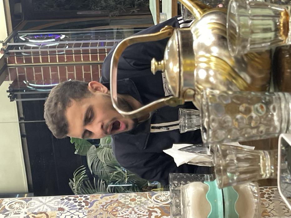 The image depicts an indoor setting at night, likely a cafe or restaurant in Homs, Syria. A young adult male with short dark hair and a beard is seated at a table, wearing a dark zip-up jacket with white stripes on the sleeves, a visible Adidas logo on his left chest. He is captured mid-action, with his mouth wide open in what appears to be a yawn. In the foreground, on a reflective tabletop, a prominent silver and gold metallic teapot is positioned on the right, partially obscuring the man. Around it are multiple small, clear glass cups, some empty, and one on the far right containing a small amount of dark liquid. To the left, a glass jar with a light teal wavy lid, likely for condiments, and a stack of white paper napkins are visible. A portion of a white smartphone is in the bottom left corner. The background features a decorative vertical panel with intricate, multicolored geometric tile patterns on the left, and large green plant leaves. On the right, a brick-patterned column with vertical reflective glass panels and integrated blue neon-like lighting is visible. An outdoor area appears dark beyond a glass partition. The precise street or establishment name within Homs cannot be identified from the visual information.