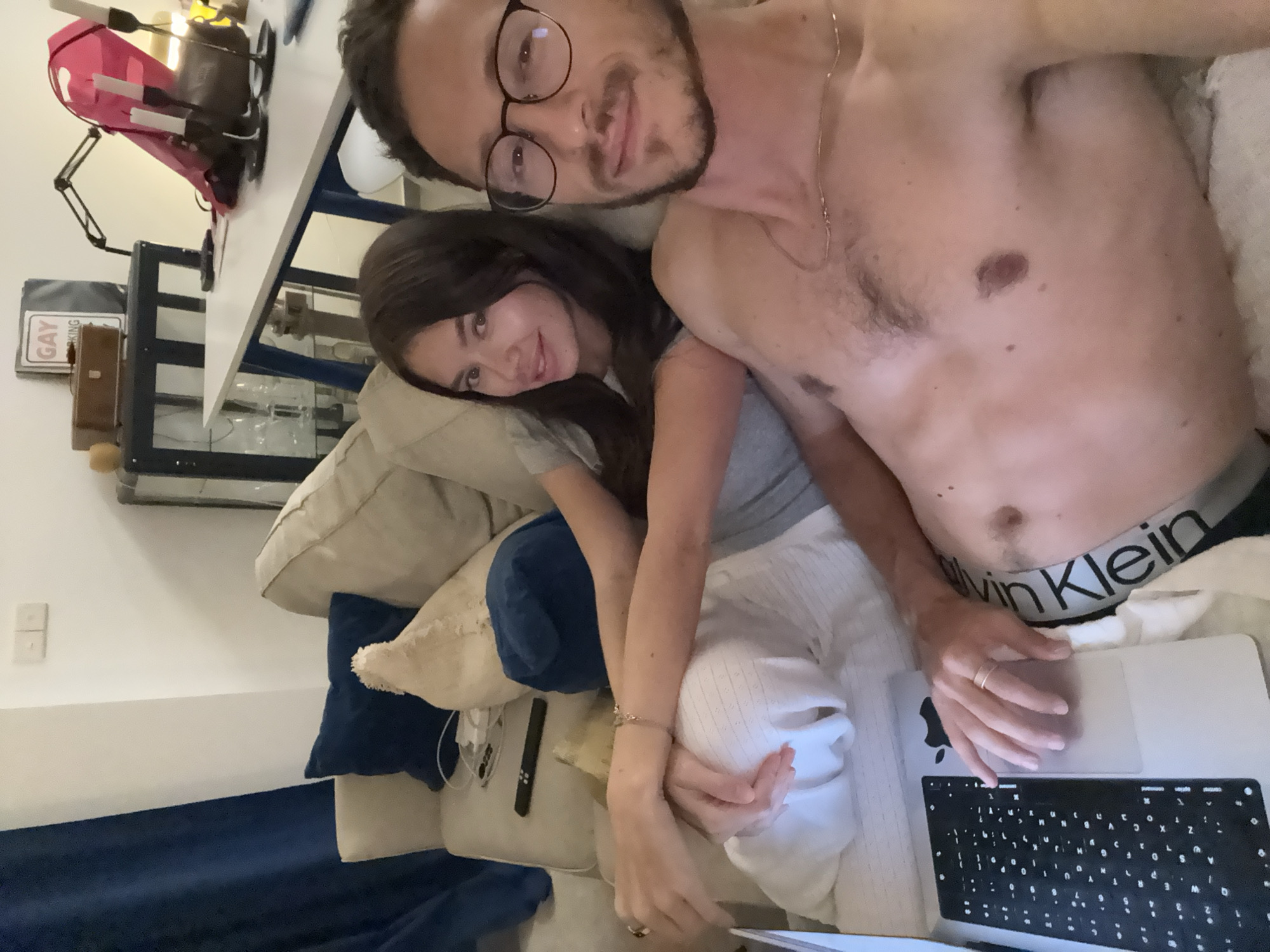 A man and a woman are lying on a couch. The man is shirtless and wearing glasses. The woman is wearing a grey t-shirt. They are both looking at the camera. A laptop is on the couch next to them. The location is possibly in a private residence in Livadia Larnakas, Cyprus.