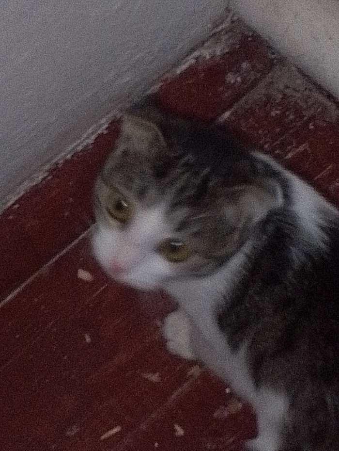 A blurry, close-up shot features a cat near a corner. The cat has a white face and chest with gray and brown markings on its head and back. Its eyes appear yellow-green. It's standing or sitting on a reddish-brown surface with wood-like grain. Debris is scattered on the surface. One side of the image is a light gray, possibly a wall. The overall image has a low-quality and unfocused aesthetic.