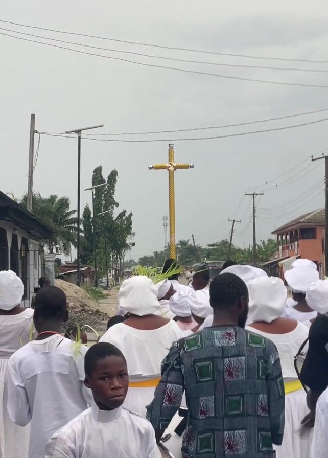 A crowd of people dressed in white robes and hats is walking down a road towards a large golden cross. Some of the people are carrying palm fronds, and one man is carrying a drum. The sky is overcast, and there are houses and power lines on either side of the road.
