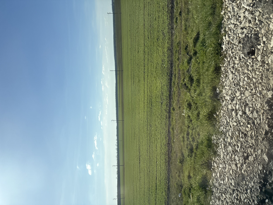 The scene depicts an expansive rural landscape in the vicinity of Senokos, Bulgaria, under a clear, bright blue sky with a few isolated white clouds. The top half of the image is dominated by the sky, exhibiting a bright solar glare in the upper left. A vast agricultural field, covered uniformly with low-growing green vegetation, occupies the midground. Approximately seven slender utility poles, fitted with overhead wires, extend horizontally across this field from left to right. The field terminates at a distant, dark green tree line that marks the horizon. Beyond the trees, the land appears to be a mix of darker, possibly fallow or tilled, ground. The immediate foreground consists of a band of light-colored, angular gravel stones, suggesting a roadside or track ballast, approximately 15% of the image height. Directly behind the gravel is a strip of unkempt green grass and brown earth, containing minimal white debris. No individuals, animals, or active subjects are present within the frame.